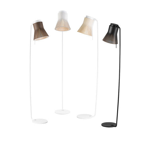 Secto Design vloerlampen kun je vinden in vier kleuren, namelijk wit gelamineerd, zwart gelamineerd, naturel berken en walnoot fineer. De vier uitvoeringen hebben een grijs frame, met uitzondering van de zwart gelamineerde variant, die een zwart frame heeft. Alle varianten hebben een zwarte kabel met schakelaar en stralen een warm wit licht uit.
